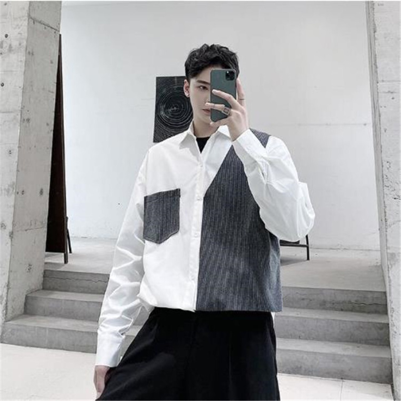 シャツ 長袖 デザインセンス トップ タイドブランド フェイク2ピース ゆったりする カジュアル